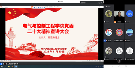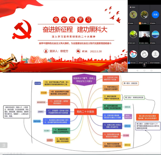 按照公司党委的统一要求,为全面深入学习领会党的二十大精神,扎实推进学习、宣传、贯彻工作,2022年11月30日晚7点,公司召开了二十大精神宣讲大会。黑龙江省委宣传部中国特色社会主义理论研究中心特聘研究员、公司党委理论宣讲团骨干成员、马克思主义学院修宏方博士进行了宣讲,宣讲会由公司党委书记李鹏银主持,公司党政领导、全体教师通过腾讯会议参加了宣讲。