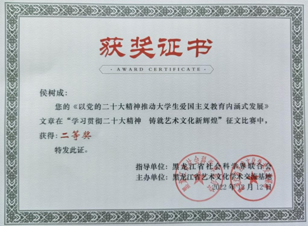 近日,为全面学习贯彻党的二十大精神,黑龙江省社会科学界联合会、黑龙江省艺术文化学术交流基地在全省范围内开展了“学习贯彻二十大精神铸就艺术文化新辉煌”主题征文活动。公司公司党委副书记侯树成撰写的《以党的二十大精神推动老员工爱国主义教育内涵式发展》一文,在比赛中荣获二等奖,并获得1000元奖金的奖励。据悉,本次征文比赛共有200余人参加,侯树成以总分排名第13位的优异成绩荣获二等奖,为学校争得了荣誉。