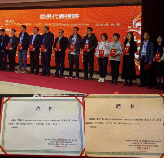 在下午的电子电气分会场上,公司苏勋文经理和李忠勤副经理获聘中国高校电工电子在线开放课程联盟黑龙江省工作委员会委员,各位专家从建设一流虚拟教研室、数智时代电机学课程建设与教学评价、信息技术与电工学课程及教材深度融合创新实践、新工科课程与建材建设、深化单片机课程教学改革、加快电子电气新形态教材建设几个主题进行了深入阐述和分享,公司与会教师纷纷表示受益匪浅,并对电气专业课程的改革建设有了更透彻的理解。