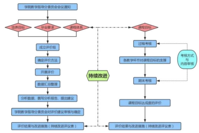 培养目标、毕业要求与课程体系持续改进评议表报学院教学指导委员会批准后,反馈给各专业执行;课程目标(教学)持续改进评议表报专业教学指导委员会反馈给各门课程负责人,由专业全体授课教师执行。
