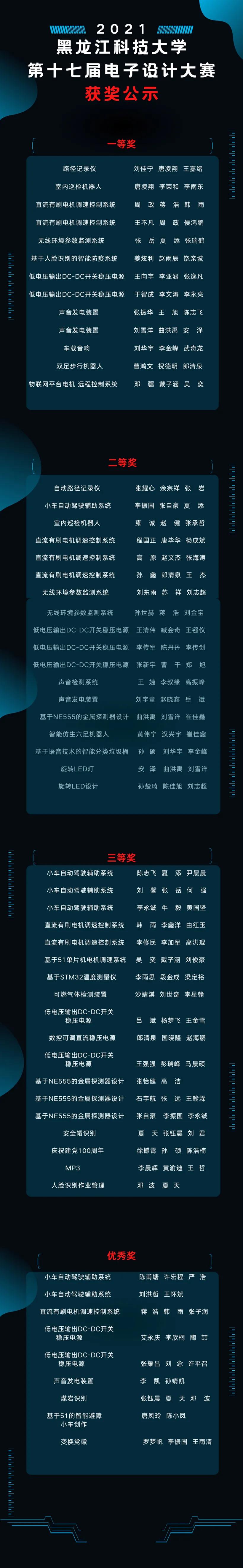 由共青团太阳集团委员会、太阳集团教务处、72779太阳集团共同主办,72779太阳集团老员工科技协会承办的第十七届电子设计大赛,历经赛前宣传、开题、报名、比赛、结题答辩、初评、复核等过程,于6月5号产生最终获奖结果,现公布如下: